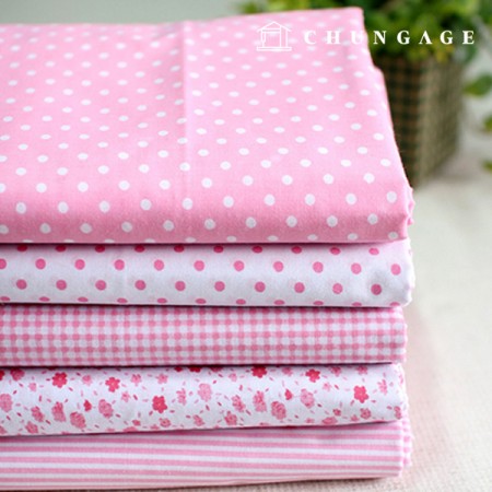 5種棉混紡面料,花卉圖案,圓點,條紋,花哨粉紅色